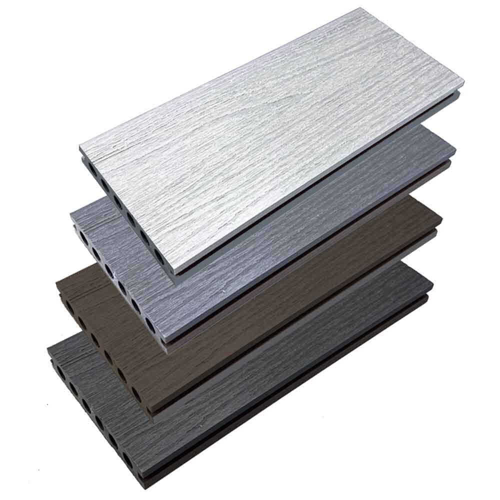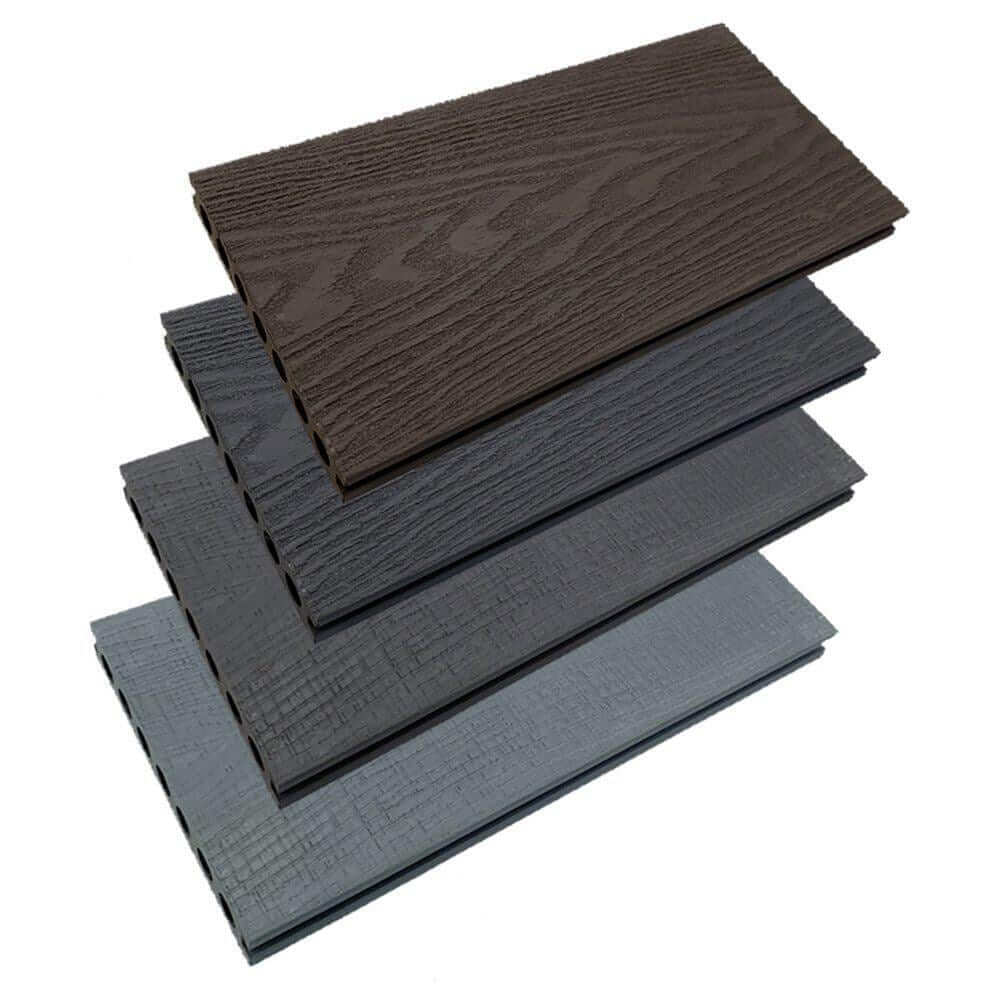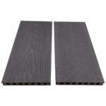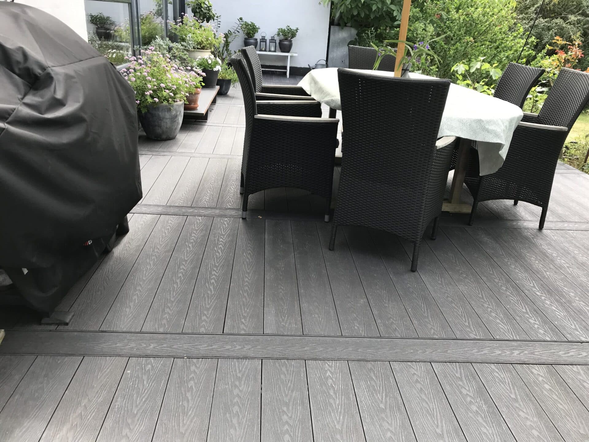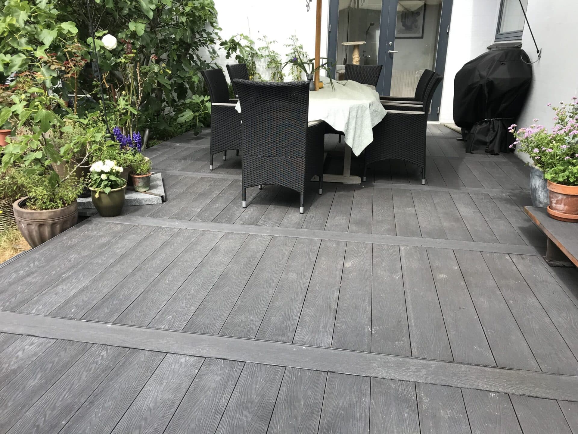 Vores komposit består af 60% træ, 30% genanvendt plast og 10% bindemiddel/farve.