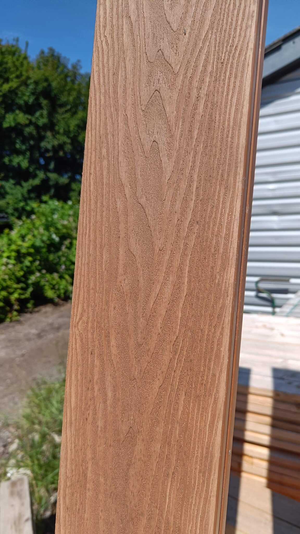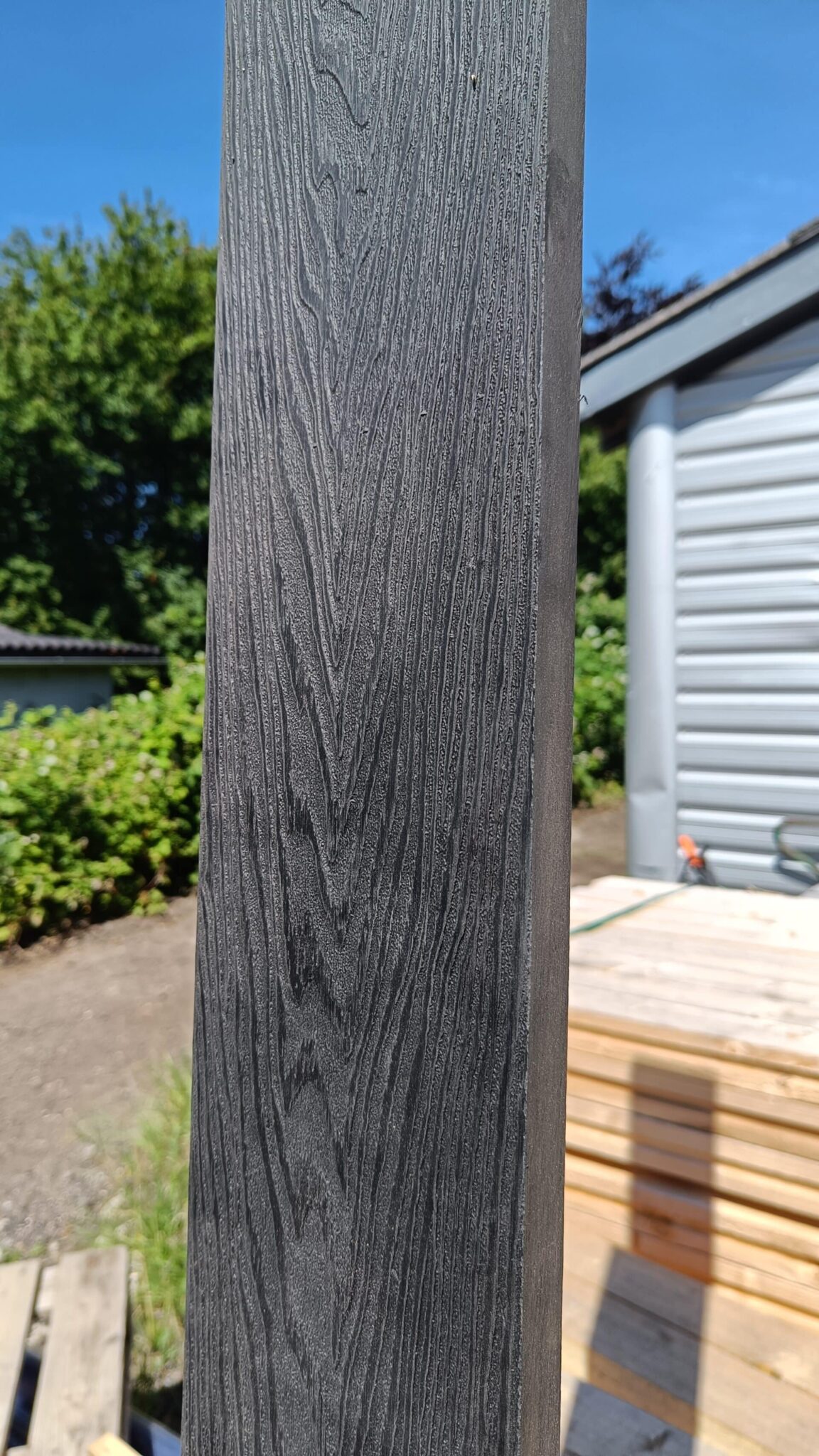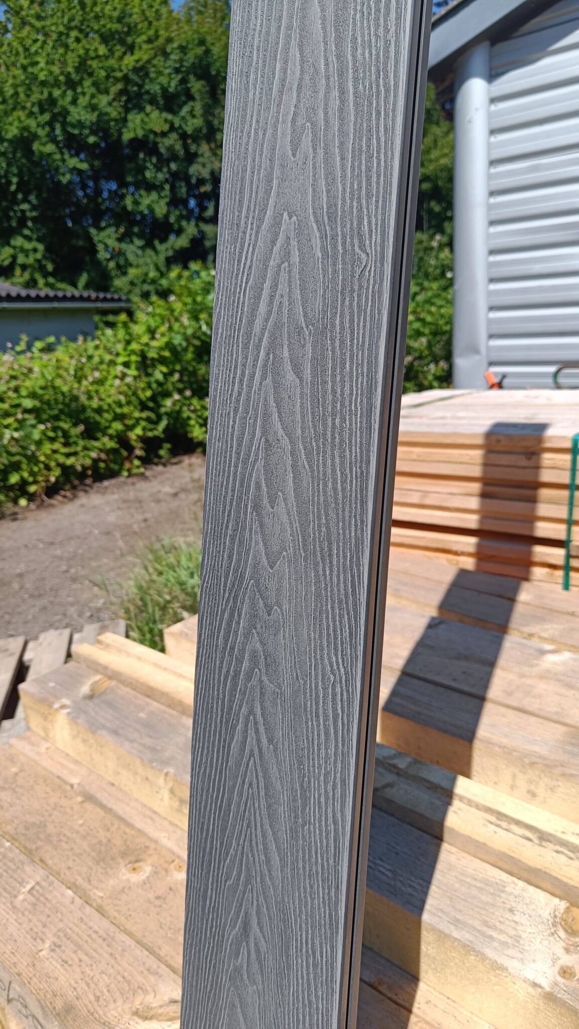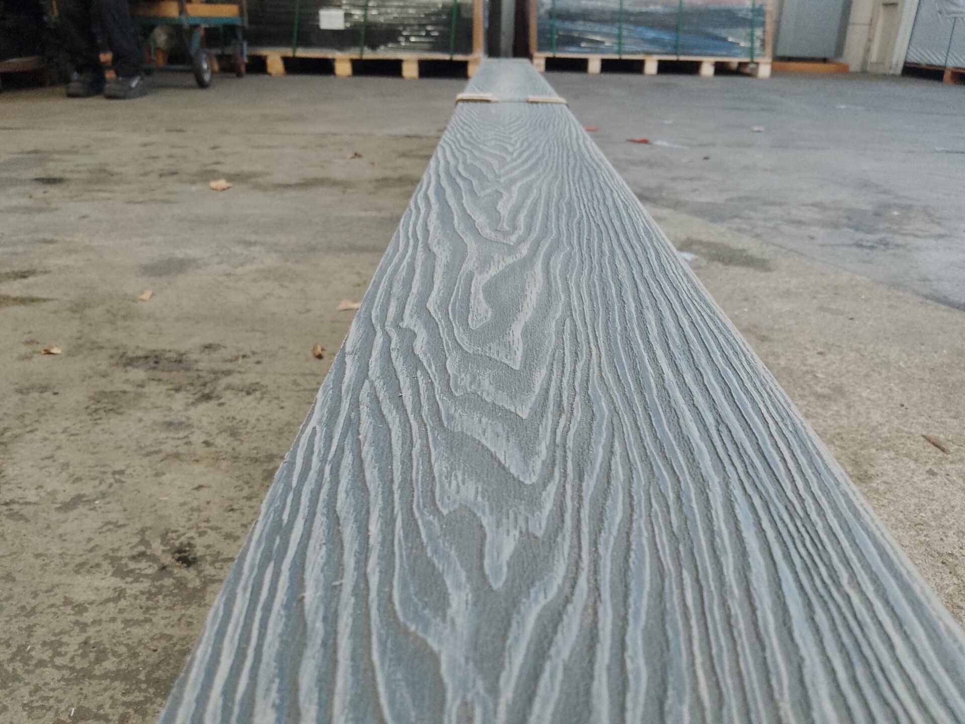 Vores komposit består af 60% træ, 30% genanvendt plast og 10% bindemiddel/farve.