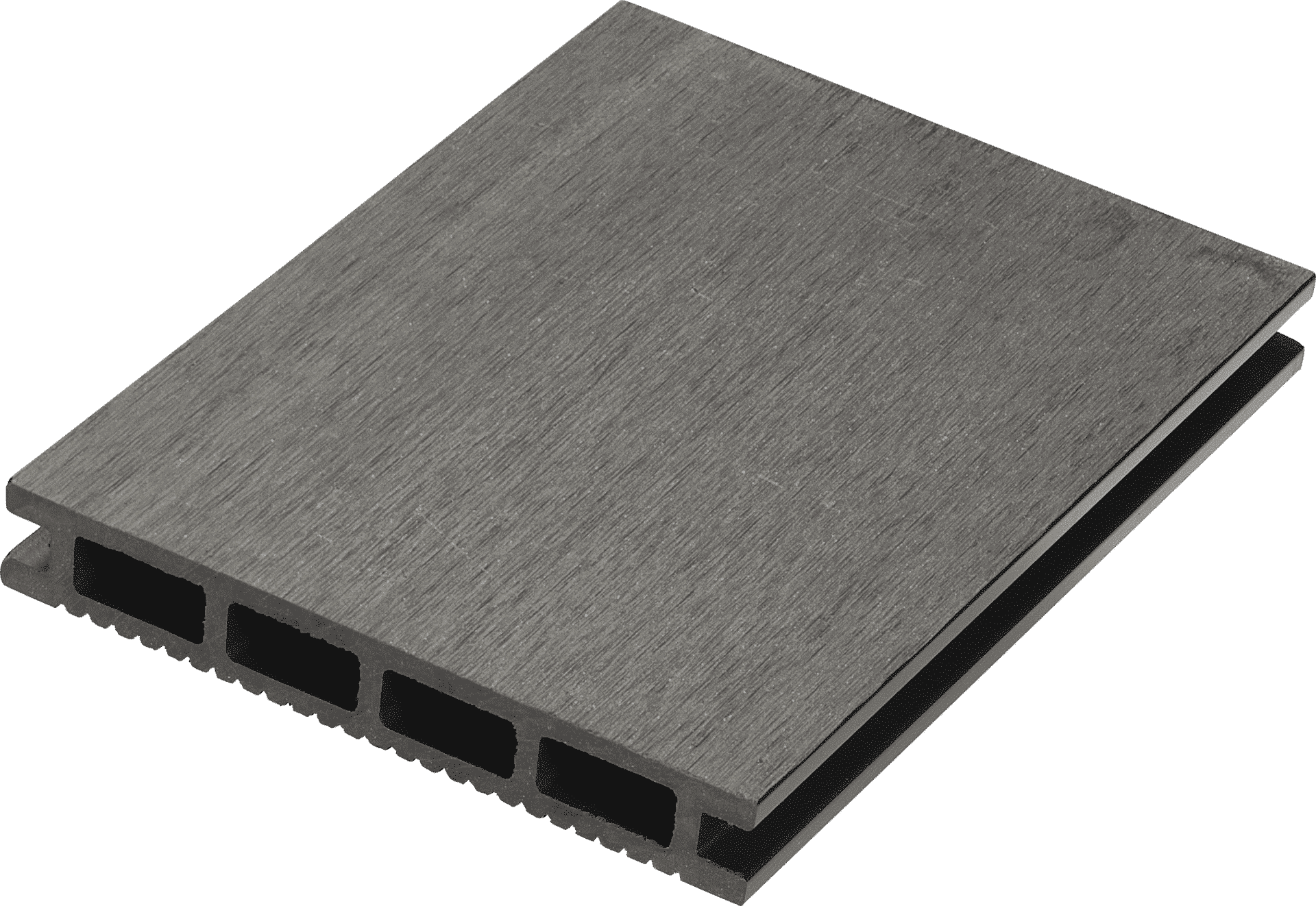 Vores komposit består af 60% træ, 30% genanvendt plast og 10% bindemiddel/farve.
