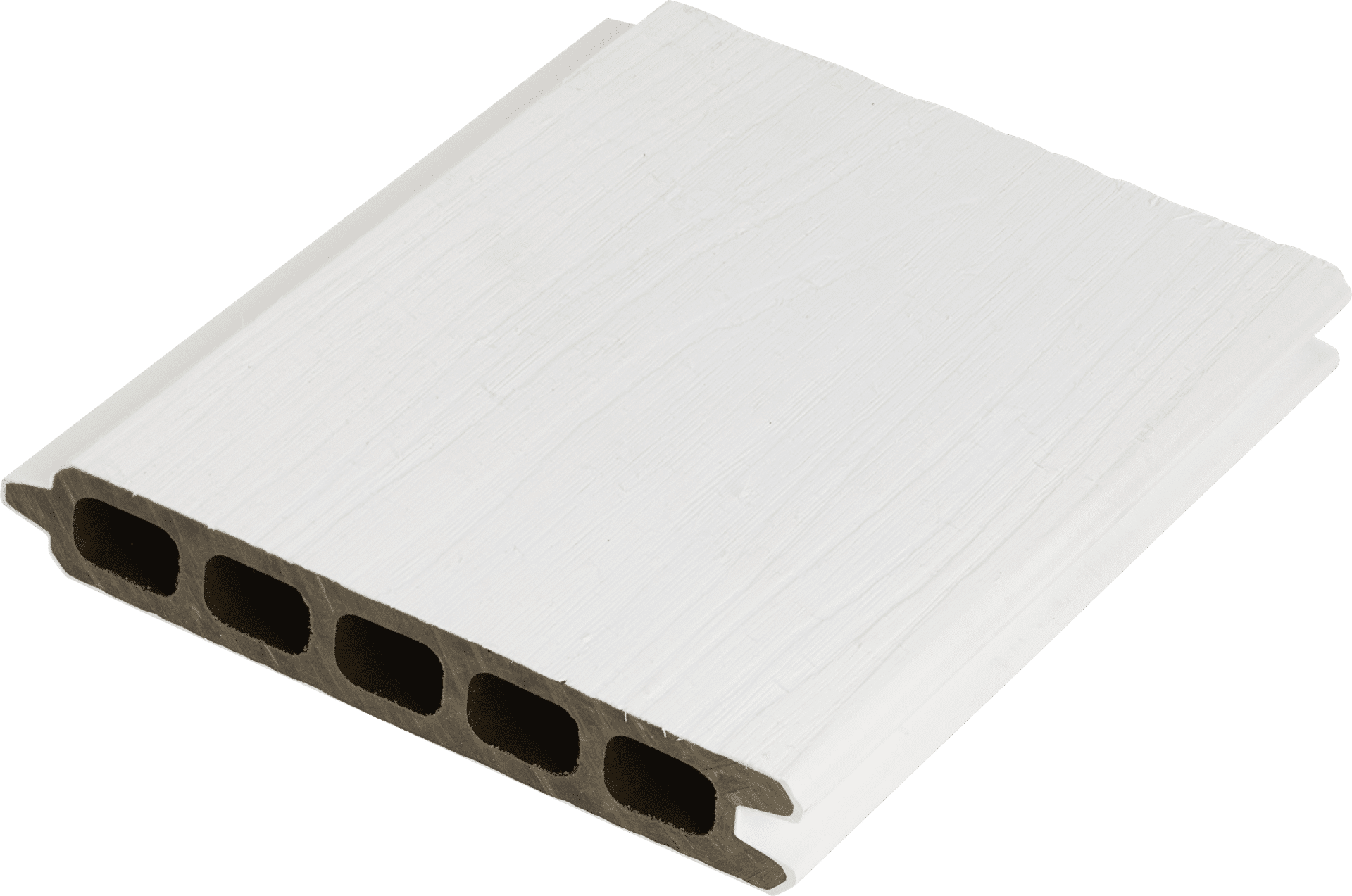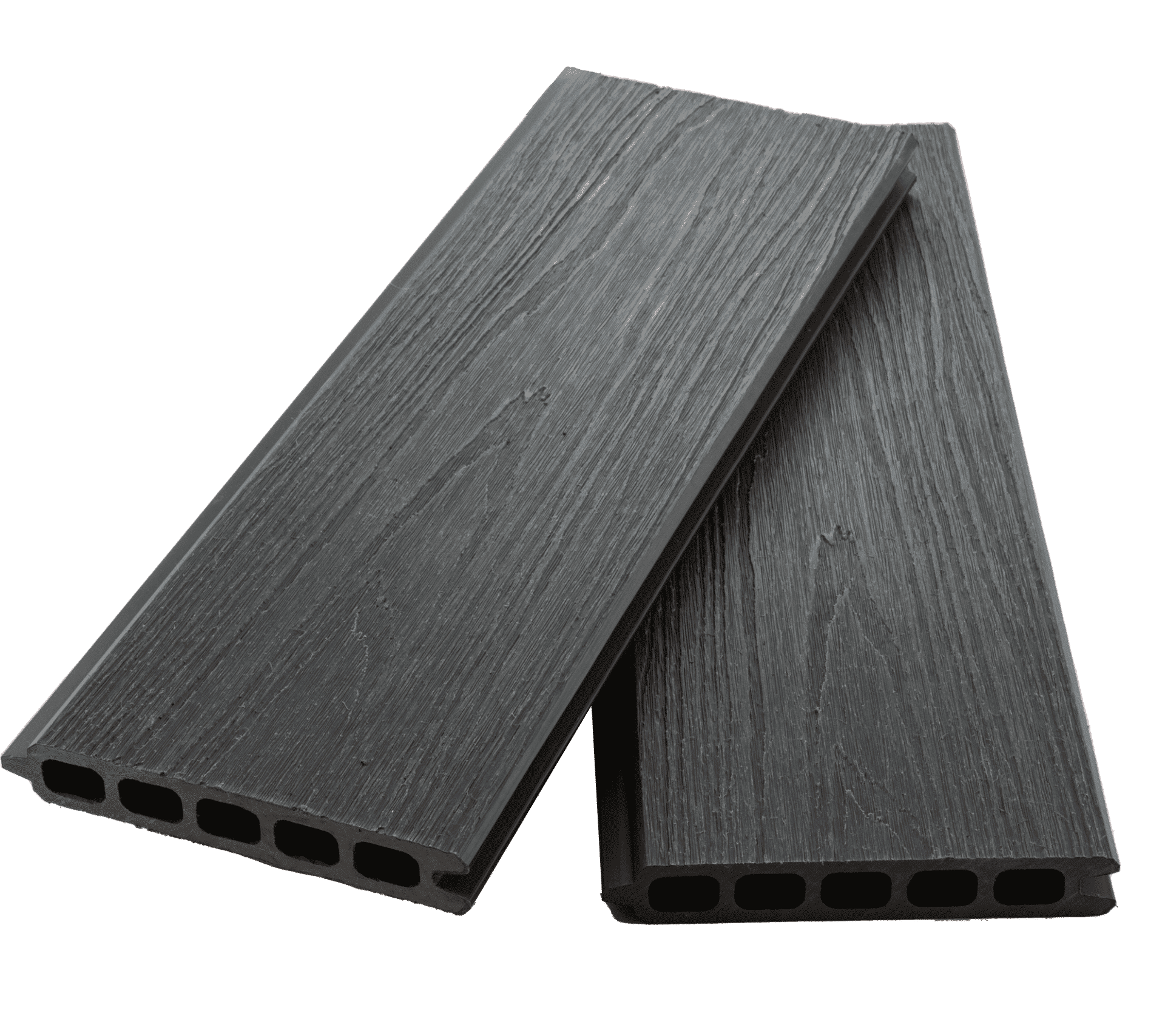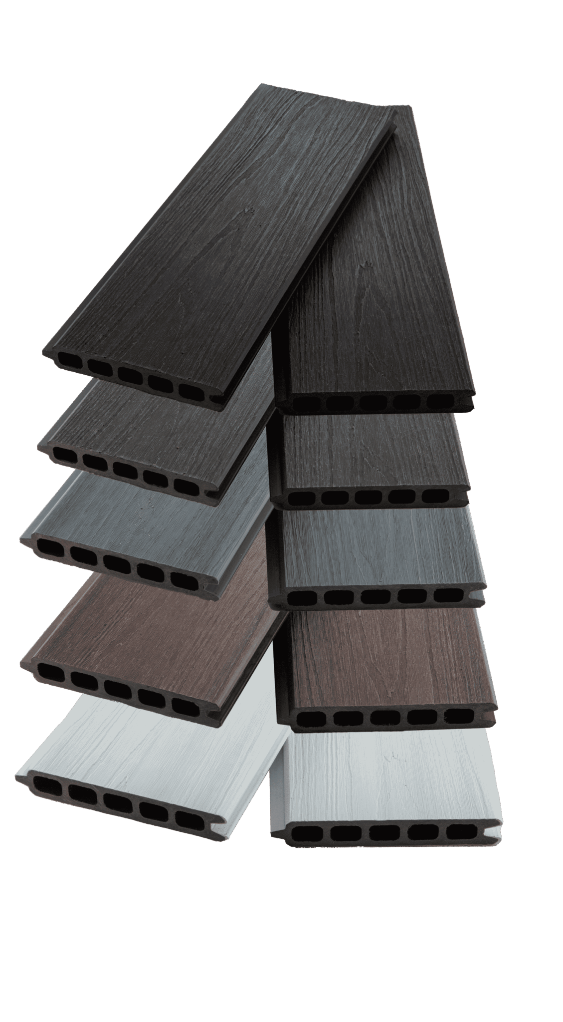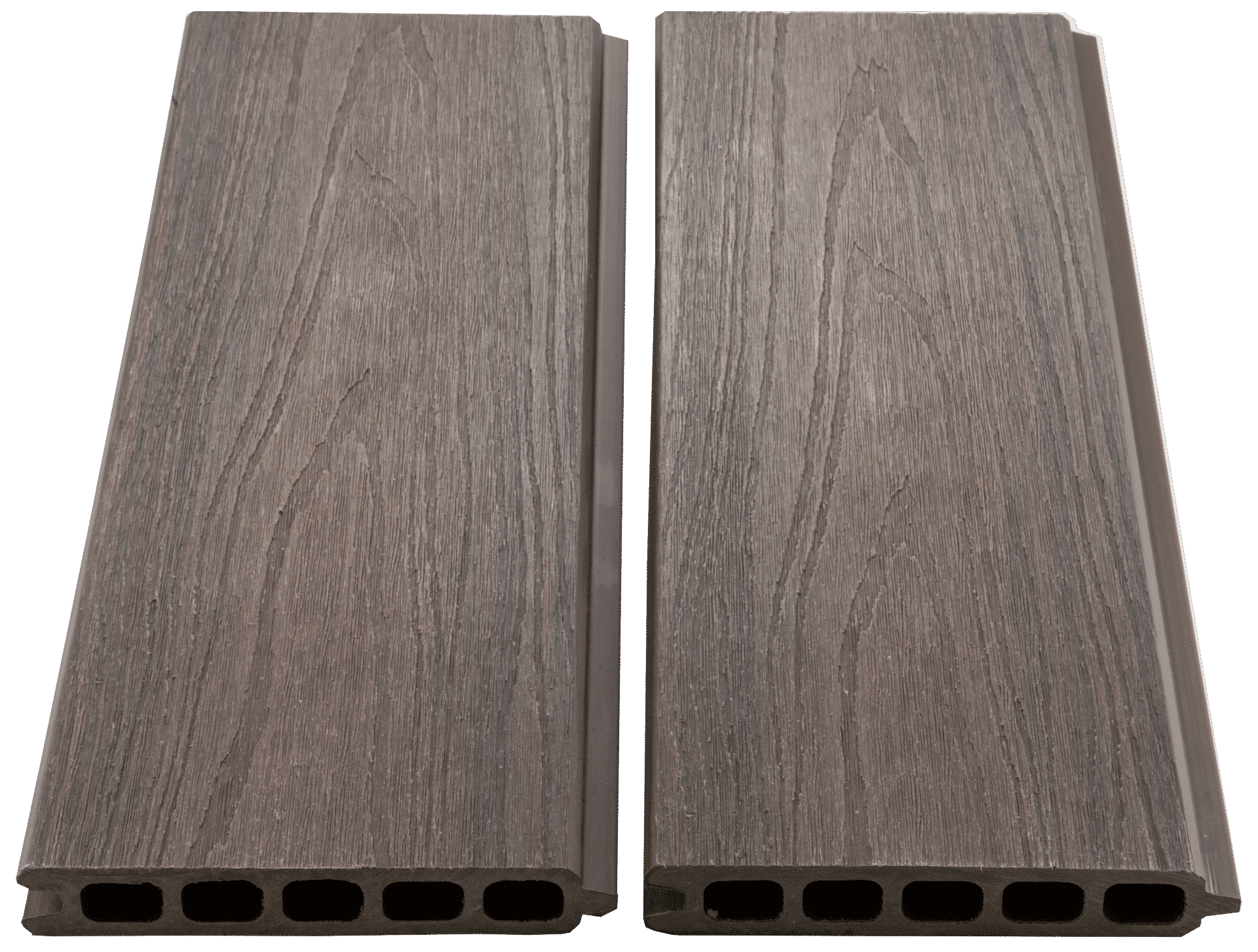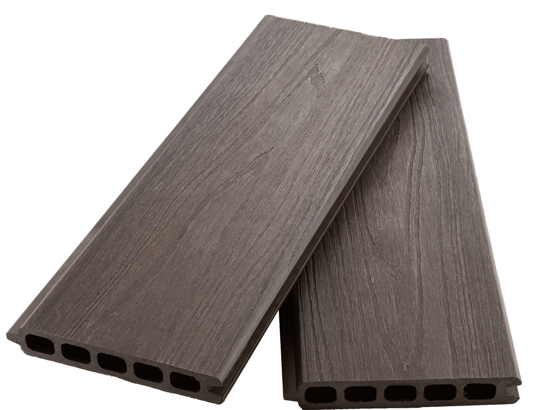 Vores komposit består af 60% træ, 30% genanvendt plast og 10% bindemiddel/farve.