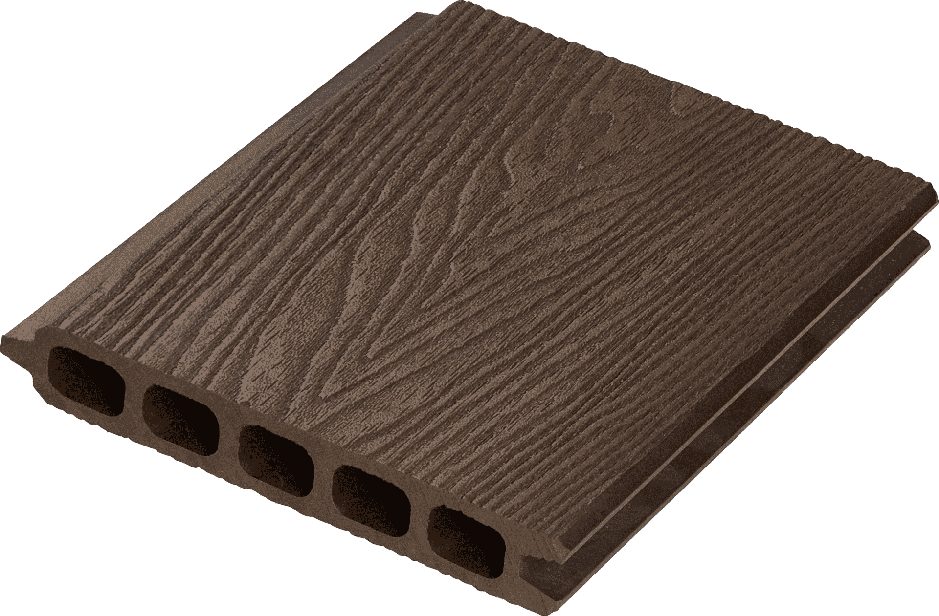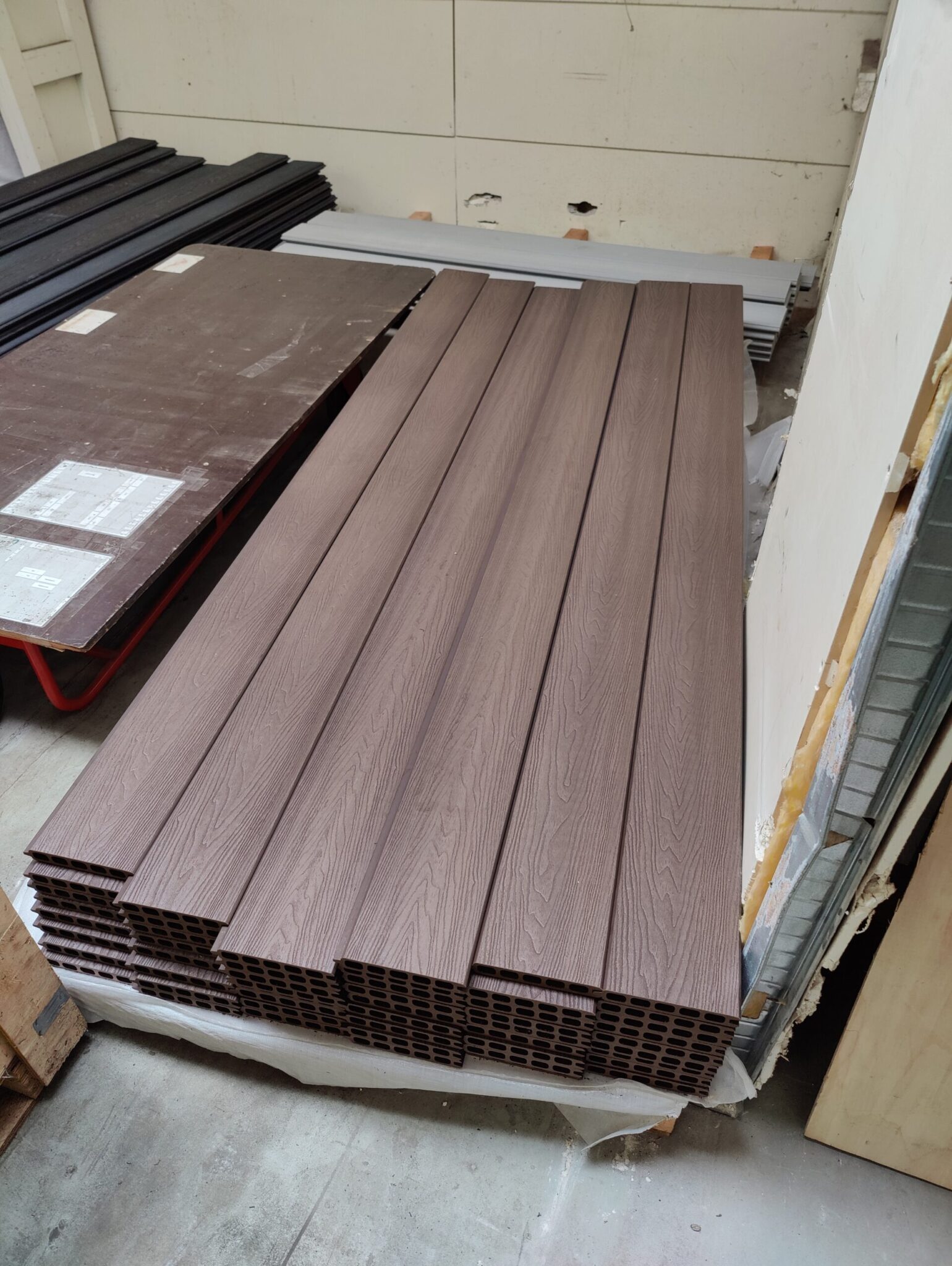 Vores komposit består af 60% træ, 30% genanvendt plast og 10% bindemiddel/farve.
