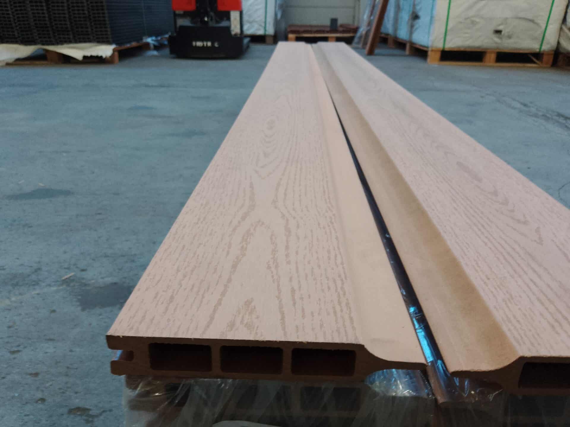 Vores komposit består af 60% træ, 30% genanvendt plast og 10% bindemiddel/farve.