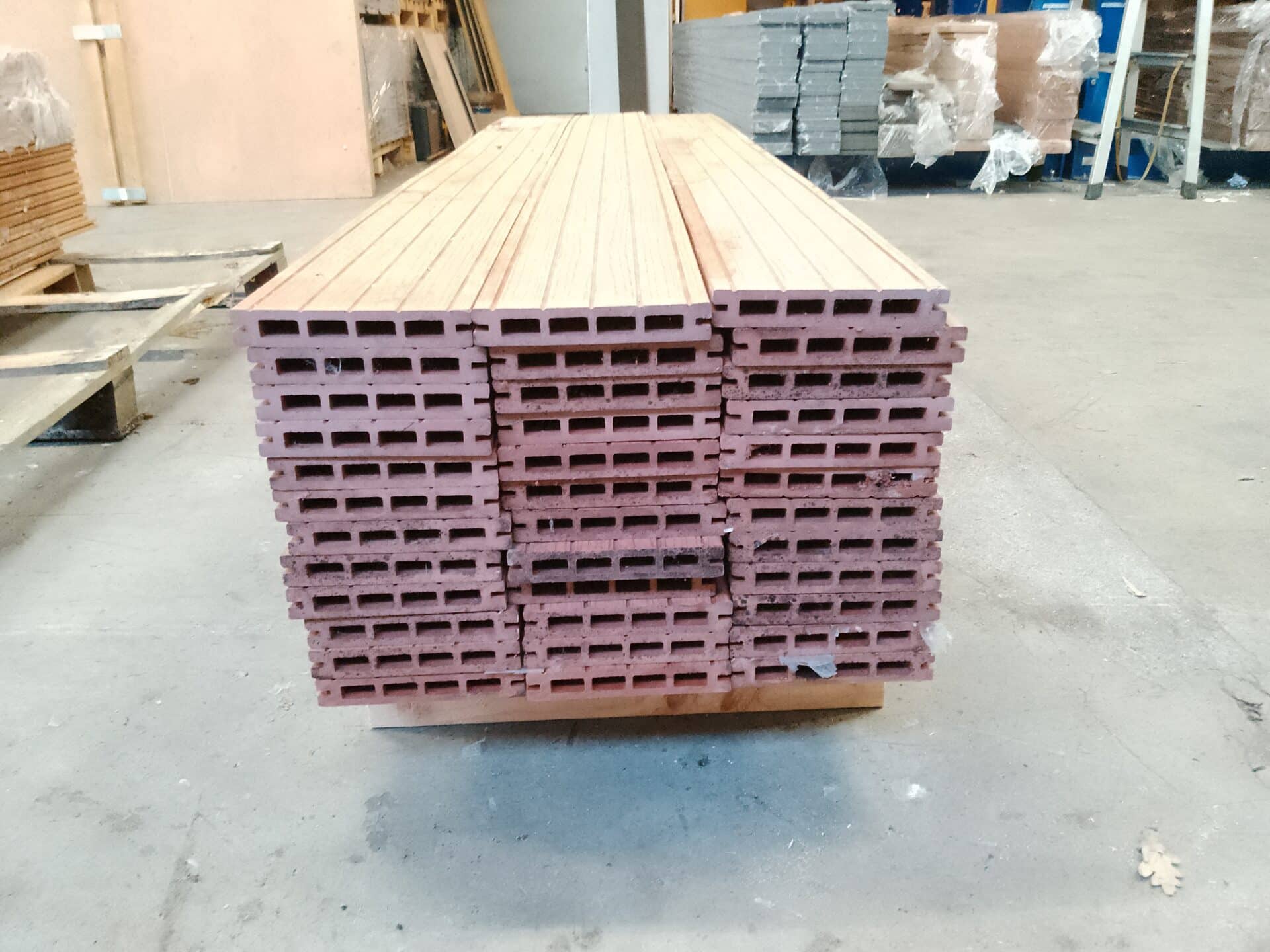 Vores komposit består af 60 % træ, 30 % genanvendt plast og 10 % bindemiddel/farve.